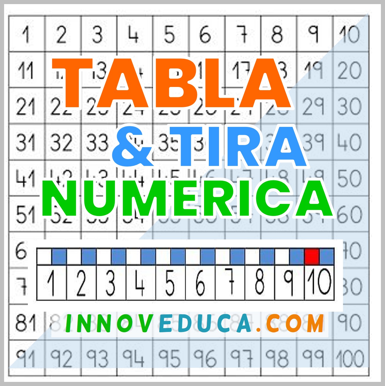Tabla numérica en la parte central rodeada de la recta numérica. Tamaño A4. Lista para descargar e imprimir.